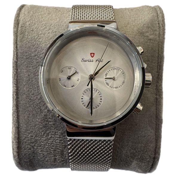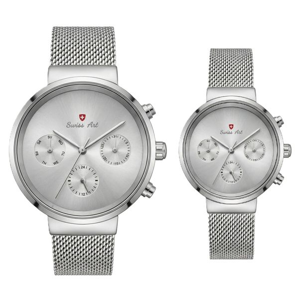 اگر به دنبال ساعتی شیک، ماندگار و متفاوت هستید، ست ساعت سوئیس آرت دقیقا همان انتخابی است که استایل شما را کامل میکند. قاب گرد و بند استیل این ست، در کنار طراحی های مدرن و بهروز، جلوهای لوکس و چشمنواز به آن بخشیده است. وجود سه موتور مختلف روز شمار برای تمام روز های هفته و ماه، این ساعت را به انتخابی کاربردی برای استفاده روزمره تبدیل کردهاست. بدنه استیل باکیفیت آن بدون تغییر رنگ، دوام و ماندگاری طولانیمدت را تضمین میکند. شیشهی سافایر ضدخش خیال شما را از بابت خط و خش راحت میکند تا همیشه ظاهری بینقص داشته باشید. با ست ساعت سوئیس آرت زمان را با حس خاص بودن و اطمینان تجربه کنید.